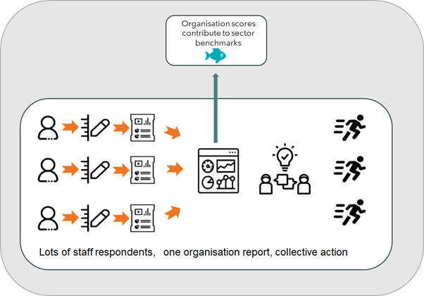 What’s special, and perhaps most important about our tool, is that it’s designed for everyone, whatever their job and whatever their organisation, AND it’s designed to be taken as a collective whole-organisation endeavour by as many people as possible. That means lots of staff (sometimes all of them) take part in the assessment process.